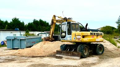 Escavatore gommato Fiat Hitachi 135 WT, riverniciato "New Holland", omologazione CE, omologazione ISPEL, targato, libretto, impianto martellone. Anno 1999 Ore 7.170