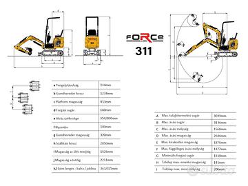 La macchina include la benna standard da 40 cm e può essere equipaggiata con benne da 20 e 80 cm, forca per tronchi, trapano da fossa idraulico, dente di trazione e martello demolitore. È dotata di trasmissione idrostatica continua, struttura pedonale con cingoli in gomma e sterzo preciso. Le misure sono 280 cm di lunghezza con braccio sollevato, 93 cm di larghezza, 133 cm di altezza e cingoli da 180 x 72 x 37 cm.
