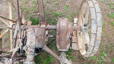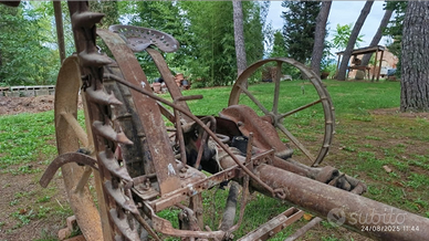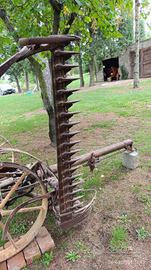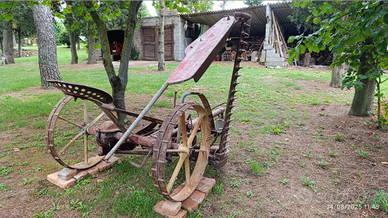 Vendo falciatrice meccanica d'epoca trainata in origine dai buoi, in buone condizioni e con funzionamento perfetto del meccanismo di taglio, seggiolino per operatore e leva manuale di alzamento e abbassamento della barra falciante.