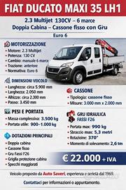 FIAT DUCATO MAXI 35 D.CAB DUCATO MAXI 35 2.3 Multijet FIAT DUCATO MAXI 35 LH1 2.3 Multijet 130CV Euro 6 Doppia cabina Cassone fisso con gruil Prezzo visto, che mezzo commerciale, si intende n.e.t.t.o quindi da aggiungere i.v.a Disponibile Fiat Ducato Maxi 35 LH1 doppia cabina, allestito con cassone fisso e gru idraulica, veicolo robusto e funzionale, ideale per edilizia, impiantistica, manutenzioni, serramenti e lavori di cantiere. Il mezzo si presenta in buone condizioni generali, con normali segni duso coerenti con la categoria, struttura sana e allestimento efficiente. La doppia cabina consente il trasporto di pi operatori in sicurezza e comfort, rendendolo una soluzione pratica per il lavoro quotidiano. Motorizzato con affidabile 2.3 Multijet da 130 CV, abbinato a cambio manuale a 6 marce, adatto a utilizzo professionale anche a pieno carico. Dimensioni veicolo: lunghezza circa 5.900 mm, larghezza 2.050 mm, altezza circa 2.300 mm, passo 3.450 mm. Cassone fisso con sponde in alluminio e griglia di protezione cabina. Dimensioni cassone indicative: lunghezza circa 3.000 mm, larghezza circa 2.000 mm. Massa complessiva 3.500 kg. Portata utile circa 9001.000 kg, in funzione dellallestimento con cassone e gru installata. Il veicolo equipaggiato con gru idraulica FASSI F26, modello affidabile e collaudato per autocarri da 35 q.li, con le seguenti caratteristiche: momento di sollevamento 2,6 tm, portata massima fino a 990 kg, sbraccio massimo circa 5,3 metri, rotazione 370°, braccio articolato con gancio e comandi manuali. Ideale per carico e scarico di materiali edili, bancali, serramenti e attrezzature da cantiere. Veicolo proposto da Auto Saveri, esperienza e seriet dal 1969. Contattaci per informazioni o appuntamento. Optional addizionali: ABS Chiusura centralizzata ESP Radio Cronologia tagliandi Gru FASSI F26, 7 posti Rif.23201179
