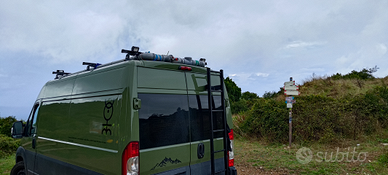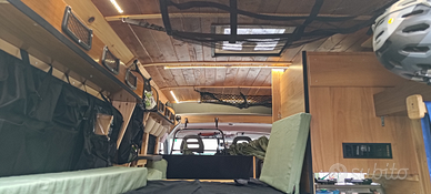 Allestimento con struttura amovibile composta da letto, amaca, gavoni e portaoggetti, lavandino con 50 litri di acqua e relativo serbatoio di scarico, wc chimico, doccia esterna, fornello da campeggio a 2 fuochi, frigo con piccolo freezer, dinette con tavolo/sedute e listelli pavimento in parquet di rovere nell'area dinette.