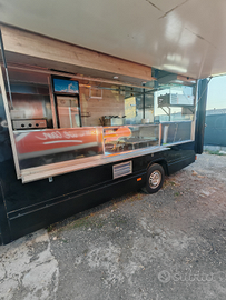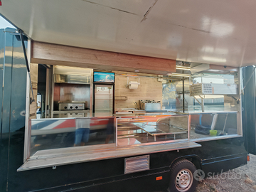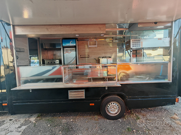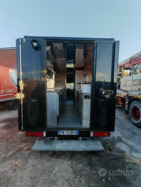 Attrezzature: frigo bevande alto, congelatore a cassetti basso, 2 frigoriferi bassi a sportello vetrina espositore frigo, vetrina ingredienti, 2 punti cappa con aspirazione, impianto elettrico e gas con bombola in vano bombole, friggitrice elettrica 2 vasche da 7 litri , piastra elettrica cm 70, generatore Dometic 4.5 kW integrato ( valore Ca. 5000 euro) cellula con entrata sia dalla cabina che nel posteriore.