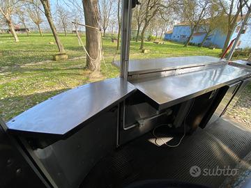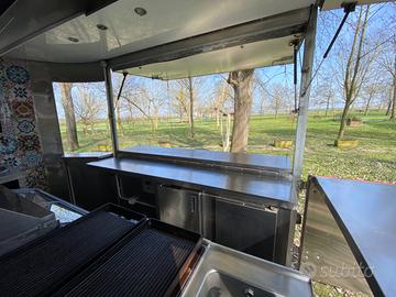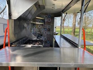 Vendo food truck mod. Horse della New Food Track Forlì in ottime condizione, visibile in foto anche nel sito ufficiale. Misure int. 300 cm x 160 cm x 210 h Rivestimento interno coibentato in acciaio inox, pavimentazione antiscivolo in gomma PVC, impianto GPL certificato a gas 25+25 litri 2 attacchi gas, impianto elettrico certificato, impianto idrico automatico a pedale con taniche di carico e scarico da 20 litri + boiler 15 litri, cappa di aspirazione in acciaio inox, banco ribaltabile in acciaio lato cliente, banco in acciaio sul retro, piano di lavoro in acciaio inox, mensole interne in inox, banco refrigerato 2 porte, congelatore a pozzetto, cucina a gas 4 fuochi compresa di piastre in ghisa per cottura alla griglia, cuoci pasta 3 cestelli, friggitrice elettrica da banco, eventuale Fry top da banco a gas. Pronto per l’attività Disponibile anche per noleggio