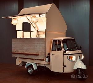 VENDITA FOOD TRUCK ALLESTITO APE PIAGGIO - MOTORE DIESEL 400 CC - ATTREZZATURA NUOVA DI FABBRICA COLORE BIANCO CON COPERTURA SOLLEVABILE E PORTA POSTERIORE DI ACCESSO. PAVIMENTO RIVESTITO IN PVC, PEDANINA SALITA POSTERIORE, N.2 GAMBE CRICK STABILIZZATRICI COLLAUDO USO SPECIALE - MANUALE NORME CE - BANCO PER ELEMENTI DI COTTURA SCORREVOLE MANUALE E PROTEZIONI FRONTALI INCRISTALLO. CAPPA ASPIRANTE FUNZIONAMENTO A 230V CELLA FRIGO DA lt. 115 DA INCASSO CON ALIMENTAZIONE A 220V, ANTA CIECA. PIANO DI LAVORO IN ACCIAIO INOX GRUPPO IDRICO CON LAVELLO INOX POSIZIONATO SUL PIANO DELLA BASE, CON POMPA ACQUA COMANDO A PULSANTE, BOILER ELETTRICO PER LA PRODUZIONE DI ACQUA CALDA, n. 2 SERBATOI. IMPIANTO ELETTRICO A 230V A NORME CE CON SALVAVITA E PRESA PER ALLACCIAMENTO ESTERNO, COSI' COMPOSTO: 4,5 ml. circa DI PROFILO LUMINOSO CON SINGOLA FILA DI LED CON SCHERMO DI PROTEZIONE. 4 PRESE DI CORRENTE SINGOLA LAMPADE A SOSPENSIONE POSIZIONATE SOTTO PORTELLONE LATERALE SMONTABILI. MANTENITORE DI CARICA, COLLEGATO CON LA BATTERIA ORIGINALE DEL VEICOLO.