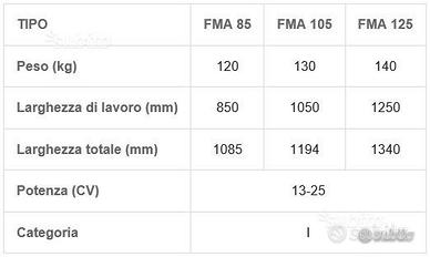 La serie FMA é adatta a trattori da 13 a 25 hp con attacco di categoria 1. I modelli FMA sono relativamente leggeri ma robusti, adatti al giardinaggio e all'orticoltura.