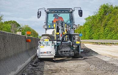 FRESATRICI AUTOLIVELLANTI (per potenze idrauliche alte). Fresatura di spessori predefiniti di asfalto e cemento. Sistema di autolivellamento (brevetto Simex) delle slitte laterali di appoggio, completa di: - tamburo standard con denti tipo asfalto; - regolazioni profondità indipendenti dx sx meccaniche con viti telescopiche; - inclinazione meccanica trasversale flottante con ammortizzatore; - attacco "ISO 24410"; traslatore laterale idraulico con attacchi di tipo universale. Per skid steer loader a 5 linee idrauliche. La nostra linea comprende per escavatore benna, pinza, pedane e rampe da carico, trincia, martello demolitore, trivella idraulica, cingoli, fresa, ruota simex, demolitrice, frantumatrice, forche, fresa ceppi, battipalo, miscelatrice, spazzatrice, cesoia e selezionatrice