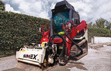 FRESATRICI AUTOLIVELLANTI (per potenze idrauliche alte). Fresatura di spessori predefiniti di asfalto e cemento. Sistema di autolivellamento (brevetto Simex) delle slitte laterali di appoggio, completa di: - tamburo standard con denti tipo asfalto; - regolazioni profondità indipendenti dx sx meccaniche con viti telescopiche; - inclinazione meccanica trasversale flottante con ammortizzatore; - attacco "ISO 24410"; traslatore laterale idraulico con attacchi di tipo universale. Per skid steer loader a 5 linee idrauliche, il prezzo si intende per la fornitura base. La nostra linea comprende per escavatore benna, pinza, pedane e rampe da carico, trincia, martello demolitore, trivella idraulica, cingoli, fresa, ruota simex, demolitrice, frantumatrice, forche, fresa ceppi, battipalo, miscelatrice, spazzatrice, cesoia e selezionatrice