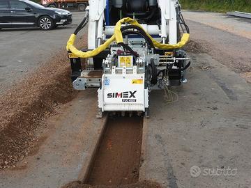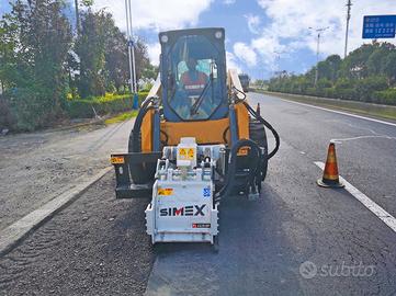 FRESATRICI AUTOLIVELLANTI (per potenze idrauliche alte). Fresatura di spessori predefiniti di asfalto e cemento. Sistema di autolivellamento (brevetto Simex) delle slitte laterali di appoggio, completa di: - tamburo standard con denti tipo asfalto; - regolazioni profondità indipendenti dx sx meccaniche con viti telescopiche; - inclinazione meccanica trasversale flottante con ammortizzatore; - attacco "ISO 24410"; traslatore laterale idraulico con attacchi di tipo universale. Per skid steer loader a 5 linee idrauliche. La nostra linea comprende per escavatore benna, pinza, pedane e rampe da carico, trincia, martello demolitore, trivella idraulica, cingoli, fresa, ruota simex, demolitrice, frantumatrice, forche, fresa ceppi, battipalo, miscelatrice, spazzatrice, cesoia e selezionatrice