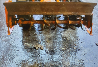 Fresatrice 'Sicma ZL-L' fissa con trasmissione laterale, completa di giunto cardanico con frizione e zappette di riserva; larghezza di lavoro 130 cm, ingombro 140 cm, peso 180 kg.