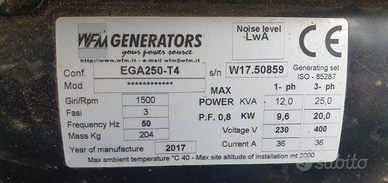 Vendo generatore di corrente WFM Generators. Anno 2017, usato pochissimo. Specifiche tecniche in foto.