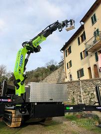 Telaio scatolato ribassato, traversa stabilizzatori a doppia uscita incrociata, cingoli con maglie in acciaio, motoriduttori di avanzamento con nr. 2 velocità e freno negativo, motore Diesel 55 Kw, N°4 attacchi per sollevamento, N° 4 piastre per stabilizzatori diametro 500 mm, Gru Effer modello 525.5S, N°2 bracci articolati con bielle e forcelle, N° 6 sfili idraulici, Rotazione continua con ralla e motoriduttore, Radiocomando, verniciatura bracci e colonna gru di colore giallo RAL 1007, martinetti neri, Verniciatura carro nero, Zavorre amovibili kg 2.000 x 2 .