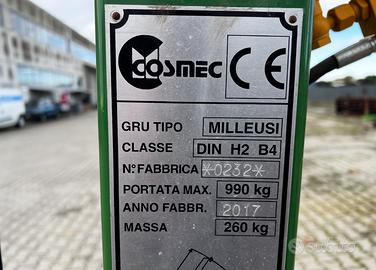 Proponiamo gruetta per sacconi Cosmec Milleusi, anno 2017, portata max 990 kg, condizioni pari al nuovo.