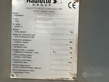 Tipo Semovente Articolata Marca Haulotte Modello HA20PX Anno 2008 Ore di lavoro 3480 N° di matricola AD121416 Alimentazione Diesel Pendenza superabile 40% Dimensioni macchina chiusa (h x largh. x lungh.) 2,67 x 2,38 x 9 Disponibilità Pronta conse Peso 11710 K Altezza di lavoro 20,65 m Sbraccio 13,50 m Portata 230 Kg Navicella 1,80 x 0,77 x 1,10 m Rotaz. cestello 90°+90° Rotaz. torretta 360° continuio Stabilizzazione No Comandi Proporzionali