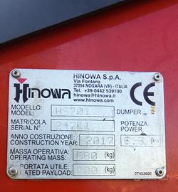 Vendo Minidumper (motocarriola) hinowa HS 701 del 2017 autocaricante con carro variabile (758-1058 mm),con carro chiuso passa da una porta(76 cm), accensione elettrica,portata utile 700 kg,(680 kg il suo peso). 2 Velocita',tendi cingolo a grasso(si registra la tensione con ingrassatore). Prezzo iva compresa. Documentazione completa (certificazione CE e manuali del mezzo). Mini dumper in ottime condizioni,pari al nuovo,manutenzione generale eseguita,pronto a lavorare. Possibile visione con meccanico di fiducia per accertamento condizioni e funzionamento. Motocariola di qualità pari se non superiore a imer,merlo,rotair,messersi,Alca,Antolini,Cormidi,*della stessa categoria*,con 3 pompe idrauliche ad ingranaggi, ognuna dedicata ad ogni singolo movimento (permette di fare contemporaneamente i diversi movimenti efficacemente,non tutti hanno questo genere di sistema idraulico adottato in macchine di categorie superiori). Accensione elettrica. Tel. 3286192079