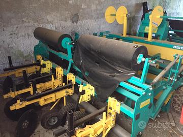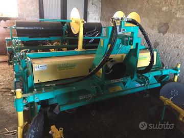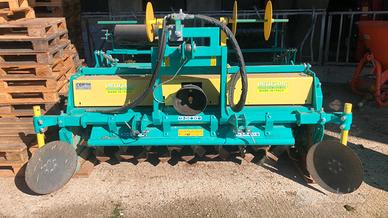 Attacco a tre punti di 1° e 2° categoria. - Potenza minima trattore richiesta di 100/120 cavalli, fino ad una potenza max. di 180 cavalli. - Riduttore "COMER" 540 giri/minuto. - Trasmissione laterale a 3 ingranaggi modulo 6. - Perni intercambiabili cementati Diam. 65mm. - Tubo rotore diam. 114x30mm. - Meccanica completamente cementata. - Doppia cremagliera registrabile con pioli in acciaio speciale da balestra Diam. 12mm. - Doppia cofanatura 6+8 mm e altri 15mm al centro dove viene posizionato il riduttore. - Carter livellatore posteriore registrabile con doppia manovella. - Carter livellatore con schiena d'asino posteriore. - Kit 4 zappette Sp. 12mm per doppia flangia Sp. 15mm. - Ruote laterali muletto full gomma registrabili complete di semiasse FIAT 40x40mm. - Dischi anteriori telescopici e registrabili, diam. dischi 460x7mm, supporti dischi ad alta velocità senza punti di ingrassaggio, tondo diam. 50mm acciaio bonificato C40. - 02 stendimanichette complete di assolcatore registrabile per l'interramento delle stesse. - 02 pacciamatrici combinate per TSA 210 completa di gruppi di rincalzo a parallelogramma, pre-vomeri, ruote bilanciere e dischi di rincalzo. - 01 Rullo idraulico per la formazione di due baulature. - Cardano T80 con bullone di sicurezza. - Verniciatura a polvere.