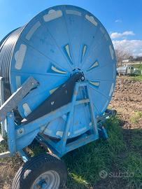 Vendo irrigatore a rotolone con tubo in polietilene e cannone irrigatore su carrello.