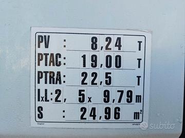 Anno 2018; Euro 6; Passo veicolo: 5.70 mt; Portata: 10000 kg; Km 300000; Clima; Radio CD; Volante multifunzione; Retarder; Vetri e specchi elettrici; Sistemi di guida assistita; 2 posti in cabina; Telecamera posteriore; Sospensioni posteriori pneumatiche; Cambio automatico; Computer di bordo; Fendinebbia anteriori e posteriori; Sponda idraulica DHOLLANDIA dotata di filocomando; Portata sponda 2000 kg; Veicolo furgonato; Dimensioni furgone (mt): 7.75x2.48x2.15; Luci interne furgone; Gommato ottimo; Veicolo omologato ADR.