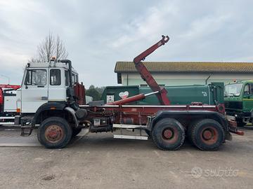 Iveco 330.35, 3 assi, 6×6, mezzo d'opera, anno 1987, cambio Hydrotrans, cassone fisso, trazione anteriore, gommato bene, campana da traino, balestrato, in buone condizioni
