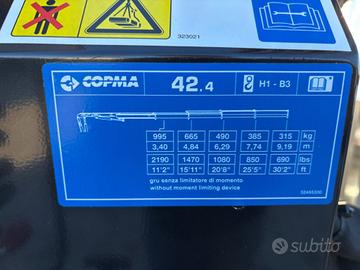 GRU COPMA 42.4, 4 SFILI IDRAULICI, PORTATA IN PUNTA A 9.19 METRI ORIZZONTALE, 315 KG - CASSONE FISSO TUTTO IN LEGA LEGGERA DIM: 3800mm CIRCA (TUTTO L'ALLESTIMENTO è NUOVO), PORTATA UTILE DEL CAMION 450KG