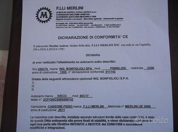 IVECO DAILY 60 C. 17, PATENTE C,3000CC,170 CV, ANNO 2006, KM 285.000, P.T.T. 60 Q.LI,PORTATA Q.LI 23,CLIMA,GOMME 90%, REVISIONE VALIDA FINO AL 03/2027,CASSONE FISSO MT.4,50X 2,30. GRU BONFIGLIOLI 5000L CON 2 SFILIIDRAULICI, PORTATA MAX A MT. 3,40 Q.LI 15, PORTATA LATERALE MAX A MT.6,40 Q.LI 7,30, SVILUPPO MAX IN ALTEZZA MT. 8,20. LA GRU HA LA DOCUMENTAZIONE DAAGGIORNARE. IL VEICOLO E L'ATTREZZATURA SONO INBUONE CONDIZIONI GENERALI. VENDITA DA PRIVATO CON ESENZIONE IVA.VISIONE E PROVA DEL VEICOLO SOLO SU APPUNTAMENTO. PREZZO € 8.900 TRATTABILI.