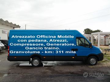 IVECO DAILY 35S14 Granvolume Furgone IVECO DAILY modello 35-S-14 anno 2009 Granvolume ATREZZATO OFFICINA MOBILE MOTO, passo lungo, tetto alto, con 311.865 km., clima, autoradio, chiusura centralizzata, lunghezza interna 440 cm., banco da lavoro con morsa, compressore, generatore, cassettiera con attrezzi completi, verricello elettrico, luci led interne, rampa pedana di salita Moto in alluminio e acciaio.