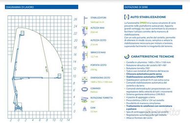 STABILIZZAZIONE IN SAGOMA , DOPPIO PANTOGRAFO ARTICOLATA , ATTACCO CESTO FRONTALE , STABILIZZAZIONE AUTOMATICO SIA DAL PANNELLO QUADRO CHE ANCHE DAL CESTO CON UN SOLO PULSANTE , STABILIZZATORI XL X STABILIZZAZIONE NON IN PIANO , AUTOCHIUSURA AUTOMATICA DAL CESTO , CONNESSIONE REMOTA CON 4.0 , MANUTENZIONE E ESTENSIONE DI GARANZIA SUL BRACCIO PRESSO LA SEDE PIU' VICINA DI RESIDENZA DEL CLIENTE