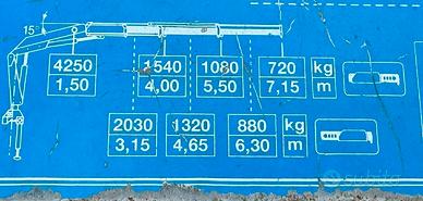 Autocarro IVECO Eurocargo 100 E 18 serie K (BLOCCAGGIO DIFFERENZIALE) Allestimento con cassone ribaltabile trilaterale e gru COPMA N. 2 piedi stabilizzatori Portata MAX gru 4250 kg @ 1.50 m Lunghezza MAX gru laterale 7.15 m (720kg) Misure del cassone: - Lunghezza 3.55 m - Larghezza 2.30 m - Altezza sponde 0.50 m PORTATA utile del cassone 3850 kg PASSO interasse 3690 mm Lunghezza e larghezza tot. 6.095 * 2.300 m Km percorsi 330.000 Anno di costruzione 2000 Pronto a lavorare senza problemi, per ulteriori informazioni chiamare.