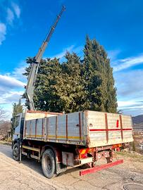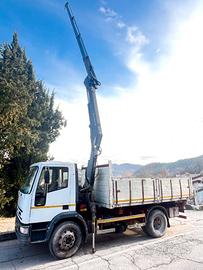 Autocarro IVECO Eurocargo 120E18 allestito con cassone ribaltabile trilaterale e gru dietro la cabina.