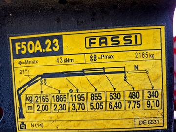 EURO 3 - Passo 3690 - Ribaltabile trilaterale m 4,10x2,20 - Gru anno 2006 Fassi F50A.23/3 Sfili idraulici, 2 stabilizzatori con Radiocomando - 3 Posti - Cambio manuale 6 marce - Bloccaggio differenziale - Sospensioni posteriori balestre - Peso complessivo Q.li 74,90 - Portata utile Q.li 22,00 - Gancio traino KG 3500.