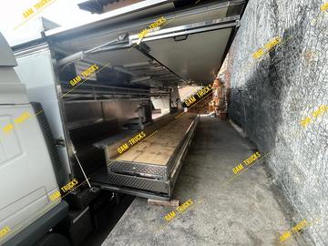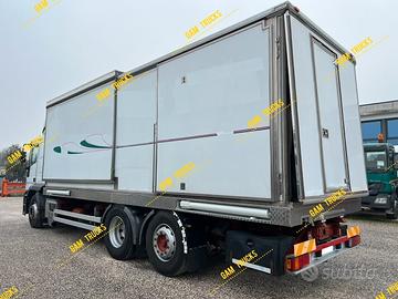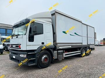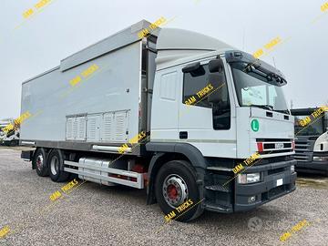 Iveco Eurotech 260E31 anno 06/2003 km 384.370 telaio intercambiabile con furgone Bolpagni per mercato con 4 stabilizzatori e radiocomando 6x2 bloccaggio differenziale anteriore balestrato - posteriore pneumatico cambio manuale ZF ZF-Intarder Euro 3 PTT 26.000kg Portata 17.600kg lunghezza totale del veicolo 10.08m gomme 60% passo 5.10m 3. asse sollevabile serbatoio 800L visiera parasole fari fendinebbia spoiler specchi elettrici cabina letto con 1 posto letto rev. scaduta