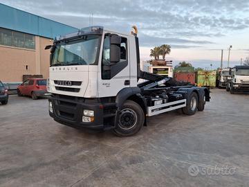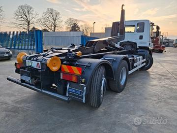 Iveco stralis 260 e 42 anno 2013 passo 4200 cambio automatico intarder euro 5 aria condizionata cabina corta tetto basso con rimorchiabilità allestita con impianto scarrabile TAM da 26 ton usato doppi comandi in cabina e rullo a discesa verticale,terzo asse intelligente e sollevabile con impianto gru