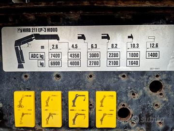 EURO 5 EEV - Passo 5700 - Pianale con scivolo di carico estraibile m 7,80x2,55 e H da terra m 1,20 - Verricello con telecomando - Gru HIAB XS 211 EP-3 Hiduo/3 Sfili idraulici con Radiocomando - Cambio automatico - Sospensioni pneumatiche integrali - Terzo asse sterzante e sollevabile - Peso complessivo Q.li 260,00 - Portata utile Q.li 95,95.