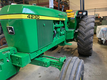Vendo a malincuore trattrice agricola marca John deere modello 4230 anno 1975 documenti ok,sostituito motore,più recente e performante,motore turbo 6 cilindri 160 cv,frizione ed impianto elettrico nuovi,pompa idraulica revisionata,idroguida,2 prese idrauliche circa 56 ql di tara mezzo tutt'ora adoperato in azienda per traino rimorchi funzionante in tutte le sue parti
