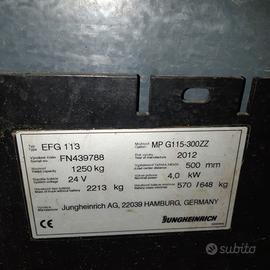 Carrello elevatore elettrico Jungheinrich EFG 113. Carretteristiche: Alimentazione elettrica. Portata Q kg. 1.300 Baricentro: 500 mm Montante: Duplex Altezza di sollevamento: 3.000 mm Ingombro minimo: 1.955 mm Alzata libera: 1.405 Ingombro max Lunghezza Forche: 1.200 mm Batteria: 24V 875Ah Gommatura: Superelastica N°Interno: G3097 GFE GROUP SRL: opera nel settore della commercializzazione multimarca di macchine nuove ed usate per il sollevamento e la movimentazione delle merci, macchine per la pulizia industriale e veicoli elettrici.