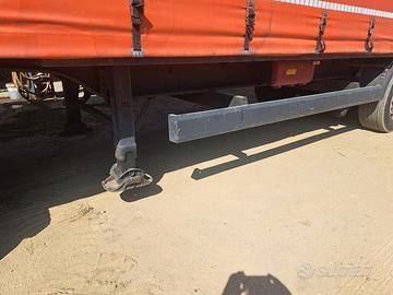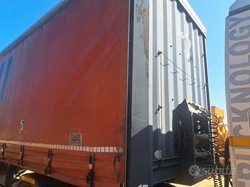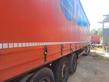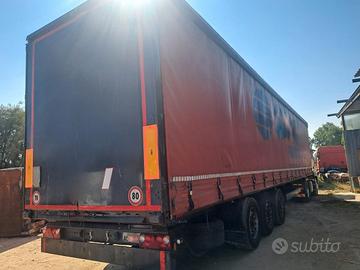 Semirimorchio centinato alla francese Krone, Anno 2003, Freni a disco, Sospensioni pneumatiche, 1° asse sollevabile, 3° asse sterzante, Porte posteriori, Lunghezza 13,860 m, Larghezza 2,550 m, Portata 31200 kg