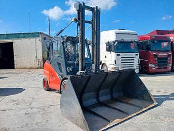 CARRELLO ELEVATORE LINDE H50D CON 5000 ORE DI LAVORO COMPLETO DI FORCHE E BENNA ALTEZZA DI SCARICO 5 mt.