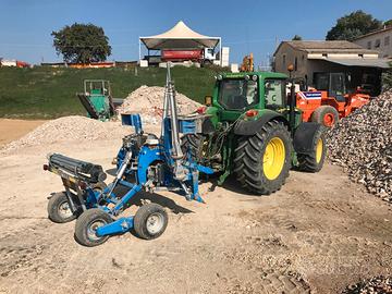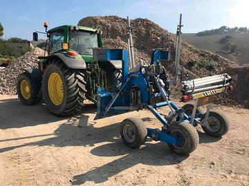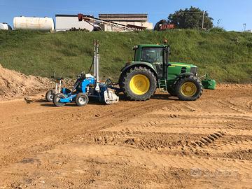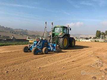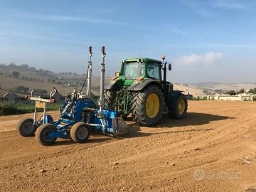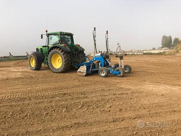 Livella trainata marca Fontana, larghezza 3 mt. lama con angolazione, grado di incidenza, inclinazione, alza abbassa lama e pali ricevitori e chiusura per trasporto su strada completamente idraulica con impianto indipendente e distributore elettroidraulico, doppio palo ricevitori laser per doppia pendenza completa di ricevitori e impianto automatico laser marca Topcon, macchina altamente professionale, condizioni pari al nuovo.