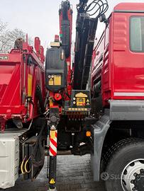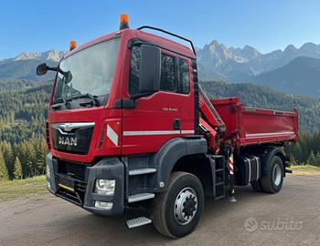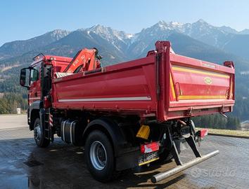 Vendesi potente e versatile autocarro MAN TGM 18.440 in configurazione 4x4 inseribile, ideale per cantieri impegnativi, lavori stradali e movimentazione materiali in contesti montani o difficili. Il veicolo è equipaggiato con una gru retrocabina Fassi ad alte prestazioni e un cassone ribaltabile lungo 4 metri