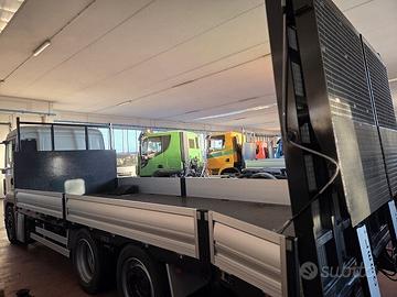 -cassone fisso/pianale da mt. 6,65 c.ca con sbalzo posteriore inclinato, sponde laterali in alluminio da 40 cm e rampe idrauliche posteriori doppio effetto.