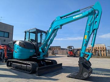 Miniescavatore Kobelco SK55srx-6, anno 2019, ore 3320, cingoli gomma, sgancio rapido meccanico, due benne, cabina A/C, certificato CE, manuale uso manutenzione. Macchina in ottimo stato generale.