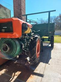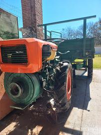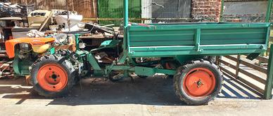 Motocoltivatore o trattore compatto prodotto dall'azienda italiana Goldoni. Tipologia:Si tratta di una macchina agricola specializzata, tipicamente utilizzata per la lavorazione del terreno, il trasporto o piccole operazioni agricole per lavorazioni in vigneti. Caratteristiche:Il veicolo presenta una configurazione classica per questa categoria, con il motore posizionato anteriormente (distinguibile dal cofano arancione e dal filtro dell'aria) e un sistema di sterzo a volante con rimorchio ribaltabile manualmente. Trazione integrale. Motore a benzina. Funzionante.