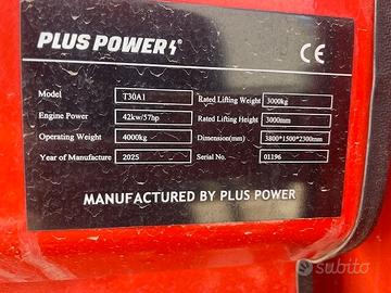 muletto sollevatore Plus Power ta30 4x4 portata massima 3 ton colonna bassa cabinato - snodato 4 ruote motrici mai utilizzato anno 2025 -