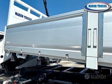 Allestito con ribaltabile trilaterale in acciaio da mt 4.50 x 2.55 con sfere antivibrazione e silenziate, sponde in alluminio rinforzate da cm 60 divise in due sezioni con piantoni smontabili a 2 leve, sponda posteriore con apertura a bandiera con rinforzo ad U, pianale in acciaio antiusura da 4mm, sabbiatura e verniciatura.