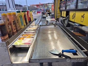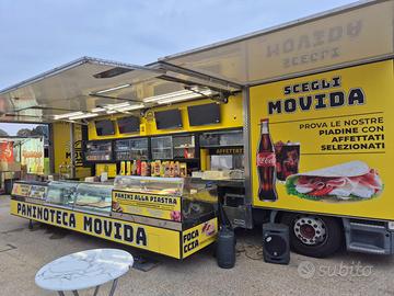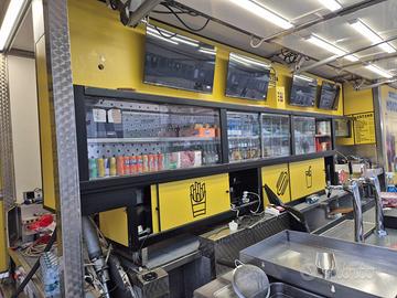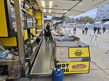 Il mezzo è completo di tutto: friggitrice, piastra, schiaccia panini, spillatore per birra, vetrina refrigerata, frighi per bibite e un generatore 9kw.