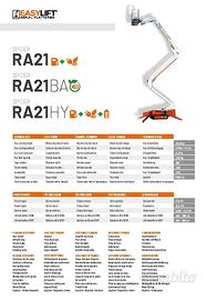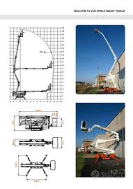 EASY LIFT RA21 Altezza massima di lavoro: 20.40 m,Sbraccio massimo dilavoro (230 kg): 9.80 m,Rotazione torretta: 360° Cestello in alluminio 1400x700x1100 h mm con portata 230Kg (2 operatori),Rotazione cestello: 80°+80° Motore Diesel/Benzina ,Pendenza superabile intraslazione: 30%,Peso totale piattaforma: 2850 kg,Ingombro stabilizzatori aterra: 2950x2950 mm,Ingombri macchina a riposo: lunghezza 5200 mm - larghezza860/1100 mm - altezza 1990 mm, Comandi elettroidraulici proporzionali, Radiocomando,Cingoli allargabili, Motore elettrico 220 V, Contaore, Presa aria/acqua, Presaelettrica 220 V Optional disponibili :Versione Benzina + batteria Litio,Diesel + batteria Litio Industria 4.0 e incentivi fiscali Grazie alpacchetto Industria 4.0 (centralina, relazione tecnica e canone 5 anni), laR210 rientra tra i beni agevolabili con: Creditod'imposta 20% ContributoSabatini 10% Zone ZES Incentivi validi fino al 31/12/2025 - Contattaci per infosempre aggiornate