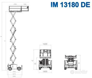 PiattaformaAerea tipo Semovente Verticale, marca IMER, modello IM 13180 DE, anno 2019, alimentazioneDiesel / Elettrica, pendenza superabile 35%, matricola IM1815024, altezza dilavoro 14,8 m, portata 400 / 500 Kg, dimensioni cestello 1,10 x 1,60 x 2,70 m, altezzamacchina chiusa 2,94 m, larghezza macchina chiusa 1,80 m, lunghezza macchinachiusa 2,93 m, peso 4900 kg, comandi elettro-idraulici proporzionali. Verificadi legge in corso di validità. Disponibile presso Savis Piattaforme Aeree.