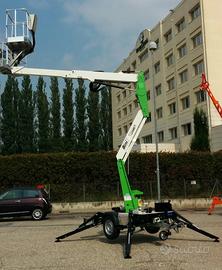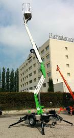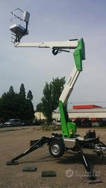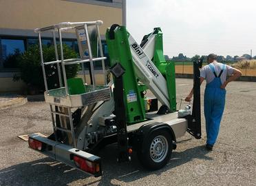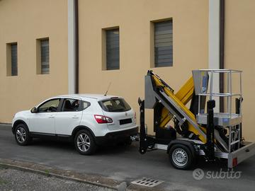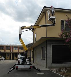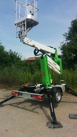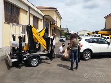 Modello X trailer, altezza di lavoro 12 metri, sbraccio 4,5 metri con 200 kg, portata in navicella 200kg con navicella in tubolare dim 1000x700x1100, impianto corrente 220V in navicella,Motore ausiliario benzina