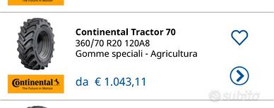 N”2 gomme per trattore Misura 360-70r20 in buone condizioni Hanno ancora il 40% dí battistrada Io le ho tolte per un problema alla trazione (Non erano da sostituire!!!) Il prezzo e per entrambi (450€ se volete trattare) 320€ non trattabili con possibilità di spedizione su pedana (50€ circa) Gentilmente no perditempo no sognatori o roba simile Nuove della continetal costano 750 cadauna Mi raccomando non le paragoniamo ad altri marchi sul nuovo