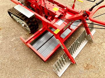Larghezza di lavoro cm 110, fornita di serie con rastrello raccogli alghe, pala spianatrice posteriore e gancio traino