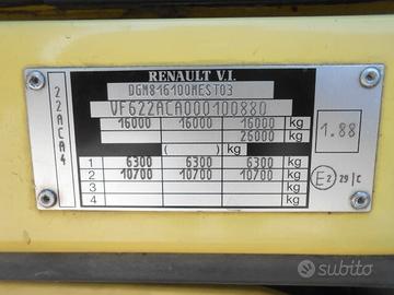 Renault Premium 250.16 4x2 Anno 07/2000 Km 602.426 Cambio manuale Passo 4800 Portata complessiva q.160 Portata utile q.77 Allestimento furgonatura isotermica Jolly Plast Dimensioni esterne furgonatura mt. 6,65x2,60 Sponda montacarichi retrattile Elefantcar da q.15 Pneumatico posteriore Gommato bene Euro 2 Veicolo non marciante in quanto va acqua nell'olio motore. Per pezzi di ricambio. Ci teniamo a specificare che ogni singolo veicolo o bene pubblicato è di proprietà della Working Trucks srl e che, tutti i beni possono essere visionati o provati presso la nostra sede.